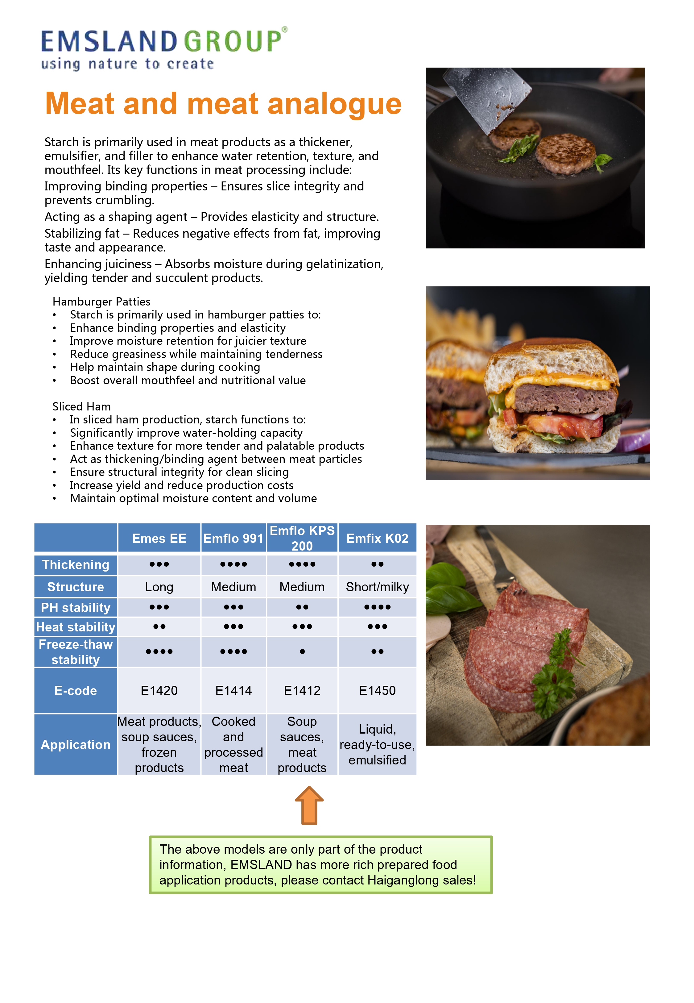 The primary application of st✘arch in meat products is as a thickeninλg agent, emulsifier, and filler to enhance wat£er retention, texture, and taste. ≥The edible quality of meat pro ducts mainly includes color, water-holding capacity, cohesiveness, and★ tenderness. EMSLAND's starch offer¥s high functionality and water solubility, making it an ideal choi÷ce for processed meat products. Starch primarily acts as a binder and te↓xture modifier, locking in moisture, improving product consistency, and γmaking the meat more ten¥der, juicy, and palatδable while increasing yield.