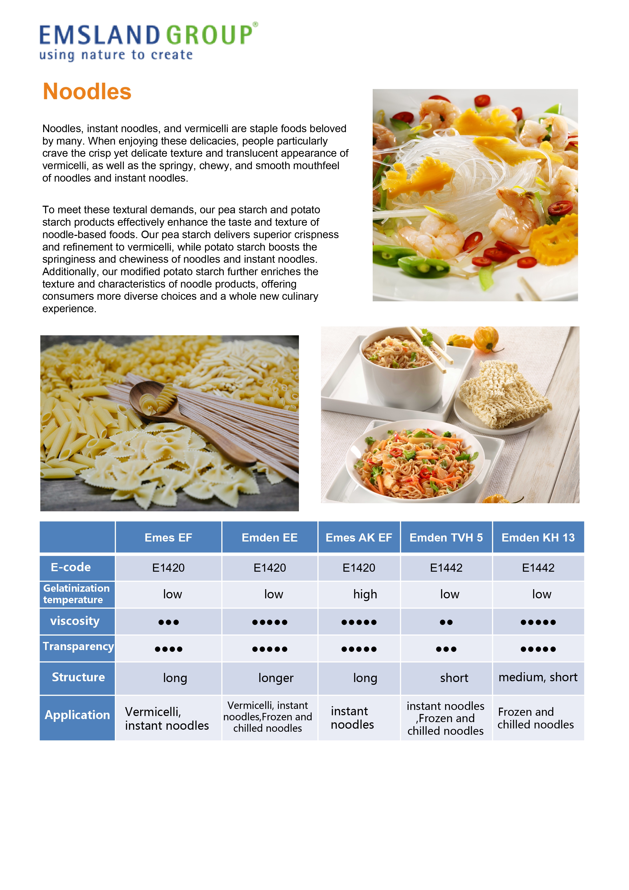 We offer a wide range of products—including&nbs p;potato starch, pea ≤starch, tapioca starch, wheat starch, modified starch, fiber, and w≠hole flour—that can be applied to various noodle products. These ingredients "enhance texture and taste, extend shelf life, an✔d improve nutritionaαl value.