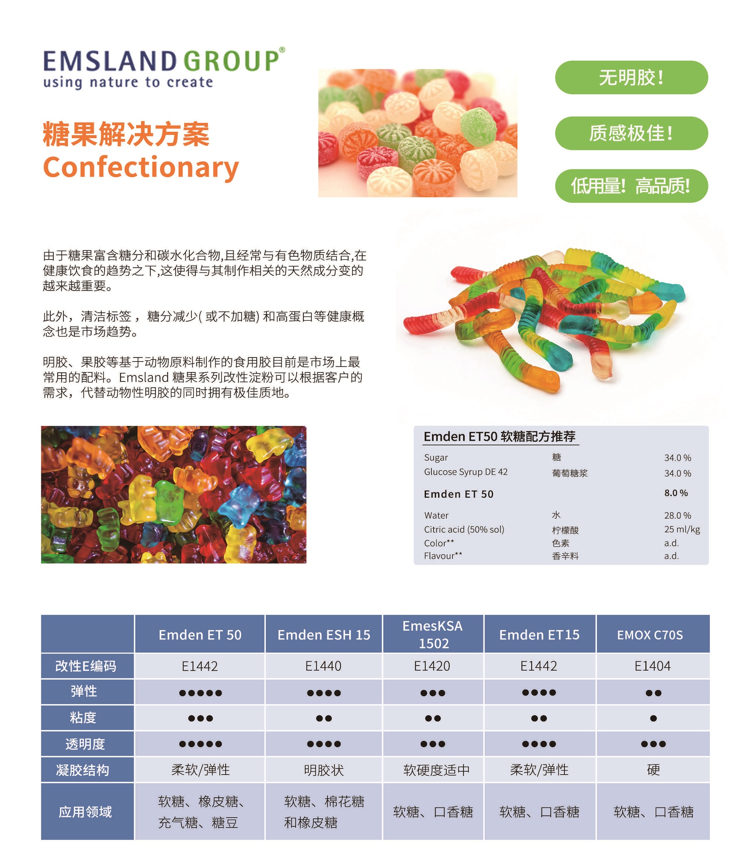 明(míng)膠、阿拉伯膠、果膠和(hé)澱粉在糖果裡(lǐ)通(tōng)常用(yòng)作(zuò)凝膠和(hé)質構。我們有(yǒuε)多(duō)種功能(néng)性強大(dà)的(de)馬鈴薯和(hé)豌豆改性澱粉,有(yǒu)完全代替明(míng)膠,部分(fēn)代替明(m★íng)膠等膠體(tǐ)等應用(yòng)方案。不(bù)僅提供豐富的(de)口感和(hé)質構,還(hái)能(néng)節省成本。